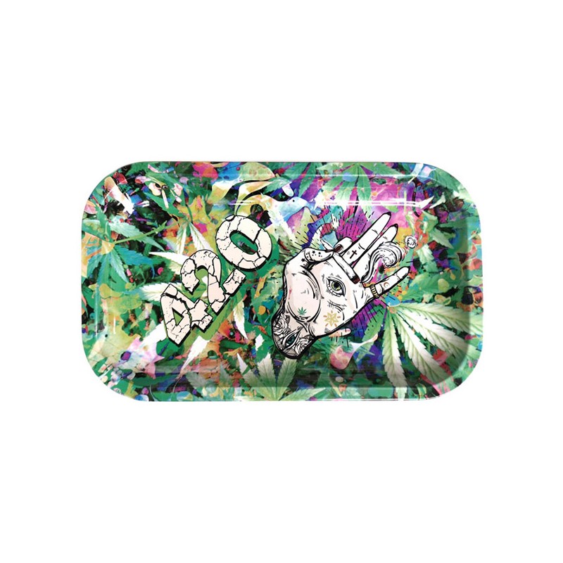 La Bandeja de Liar de 420 Vibrant de la marca V Syndicate combina funcionalidad y diseño vibrante, con el icónico número 420 en fucsia y hojas de marihuana en verde brillante.