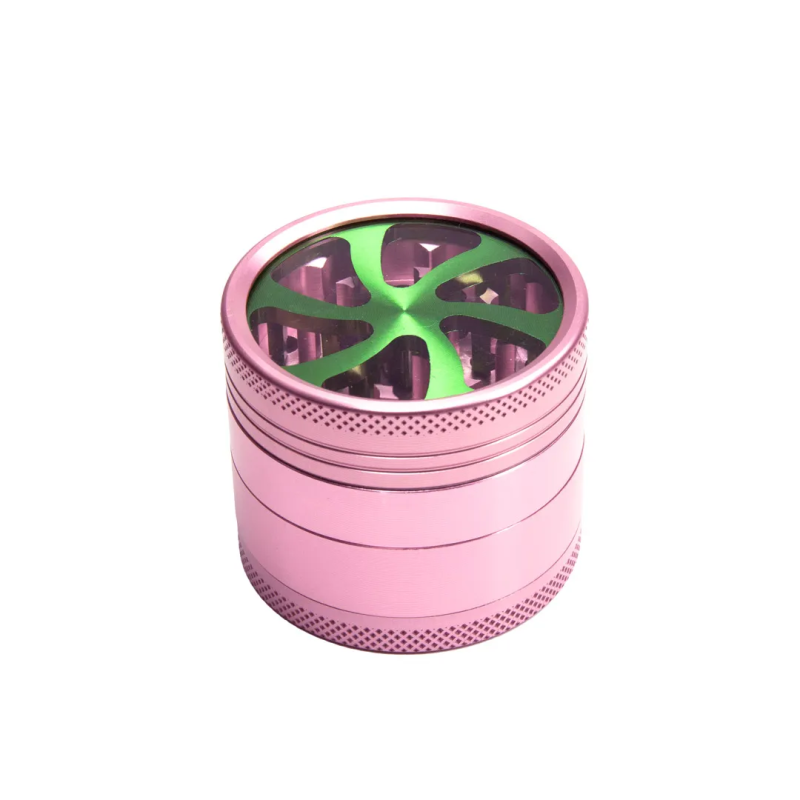 Este grinder de cuatro niveles está fabricado en aluminio de alta resistencia con un acabado anodizado en color rosa metálico. Su característica más distintiva es la ventana superior transparente, que permite supervisar el proceso de triturado en tiempo real sin necesidad de abrir el dispositivo, optimizando el tiempo y la eficiencia de la molienda.