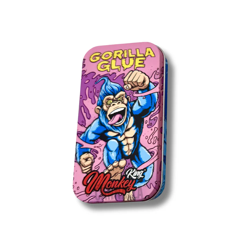 Esta caja metálica de la marca King Monkey presenta unas dimensiones de 11.5 x 6 x 2 cm, ofreciendo un almacenamiento compacto y resistente con un diseño artístico inspirado en la variedad "Gorilla Glue"