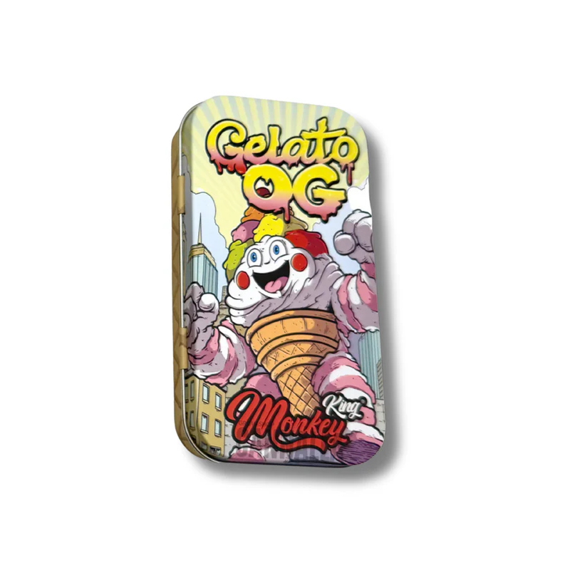 Esta caja metálica de la marca King Monkey presenta unas dimensiones de 11.5 x 6 x 2 cm, ofreciendo un almacenamiento compacto y resistente con un diseño artístico inspirado en la variedad "Gelato OG"