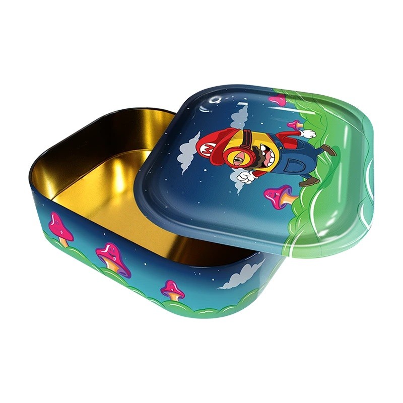 Bandeja de liar metálica inspirada en Rick and Morty con un diseño psicodélico de Rick. La bandeja encaja en su propia base para formar una caja compacta y discreta, ideal para guardar accesorios de forma práctica y cotidiana. Medidas: 18x14 cm